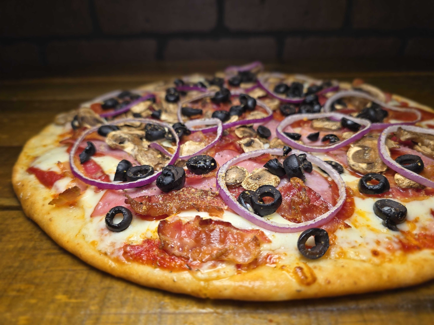 This mouthwatering Gluten-Free Supreme Pizza comes loaded with Pepperoni, Breakfast Bacon, Canadian Bacon, fresh Mushrooms, Black Olives, Red Onions, Mozzarella Cheese, and our signature Pizza Sauce. Available in a 14" size.