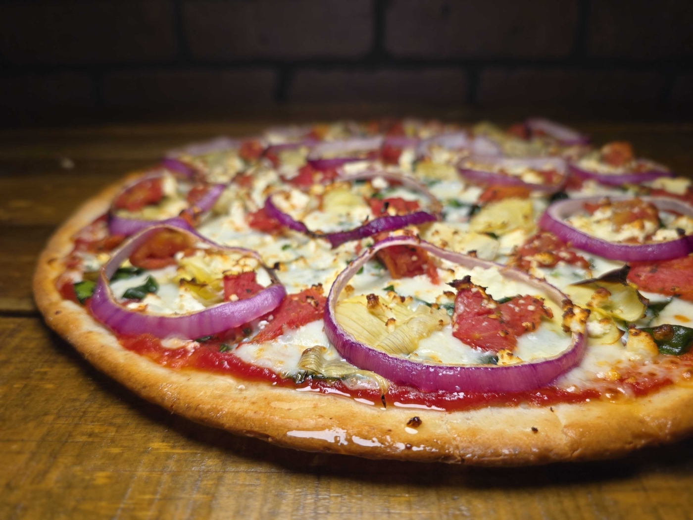Our Gluten-Free Veggie Xtreme pizza is a vegetable lover's dream. It features a delicious combination of fresh Spinach, Artichoke Hearts, Sicilian Spiced Tomatoes, and Red Onions, all topped with Feta Cheese and Mozzarella Cheese. Our signature pizza sauce ties it all together, creating a perfect balance of flavors. Available in a 14" size.