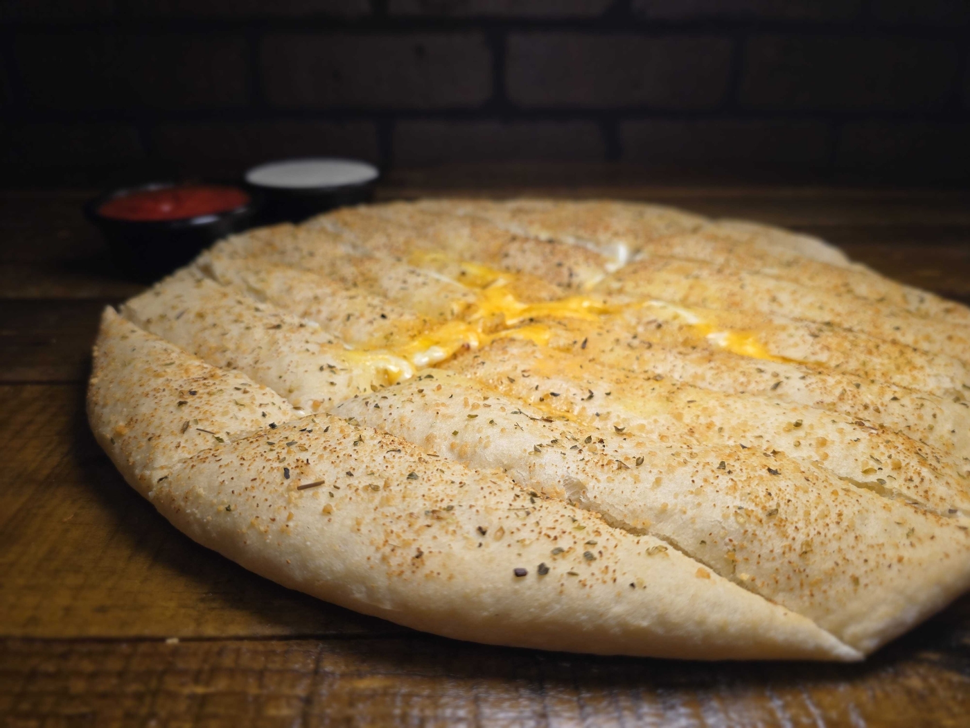 (Breadsticks stuffed with cheese) Satisfy your craving for cheesy goodness with our 14" breadsticks, with a blend of Sharp Cheddar and Mozzarella Cheese, brushed with Olive Oil and seasoned with Garlic, Oregano, Parmesan, and Romano Cheese. Accompanied by creamy Ranch sauce and Pizza Sauce for dipping.